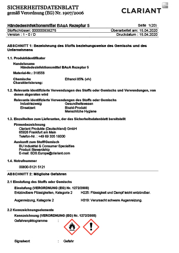 Händedesinfektionsmittel BAuA Rezeptur 5 Hergestellt nach der Allgemeinverfügung der BAuA vom 09.04.2020